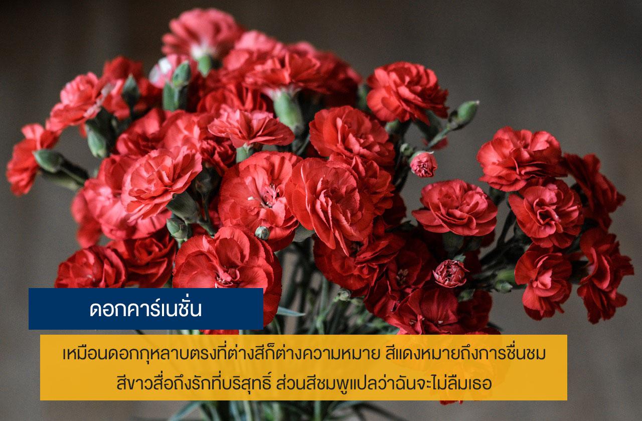 ดอกคาร์เนชั่น - เหมือนดอกกุหลาบตรงที่ต่างสีก็ต่างความหมาย สีแดงหมายถึงการชื่นชม สีขาวสื่อถึงรักที่บริสุทธิ์ ส่วนสีชมพูแปลว่าฉันจะไม่ลืมเธอ